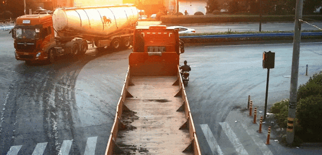 大货车在右转弯过程中,由于内轮差(前后轮转弯半径不同)而出现一处弯月形状的盲区,所以驾驶电动自行车在道路上行驶时,要和大货车保持足够的安全距离,不要与转弯的大货车同时进入路口。